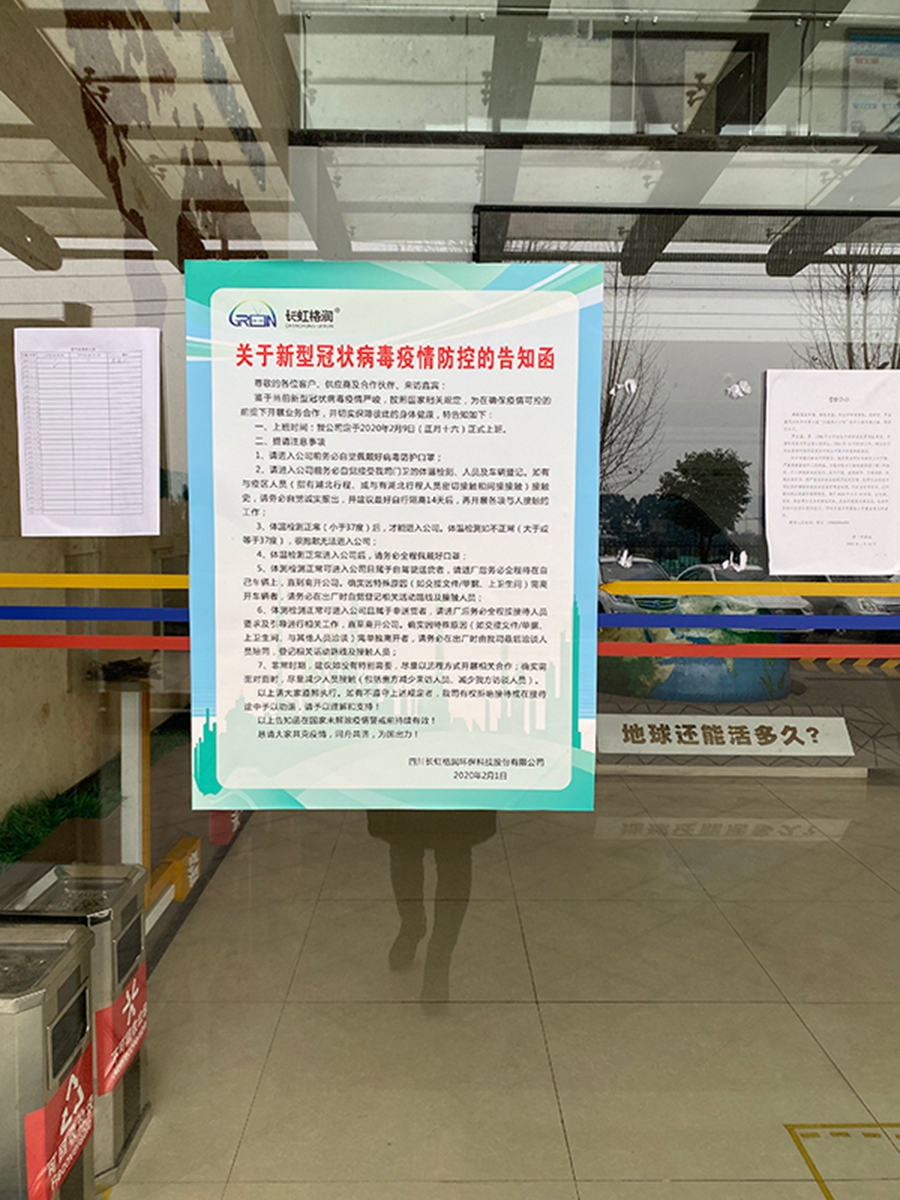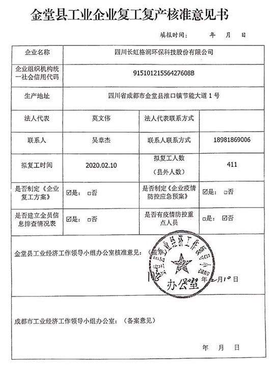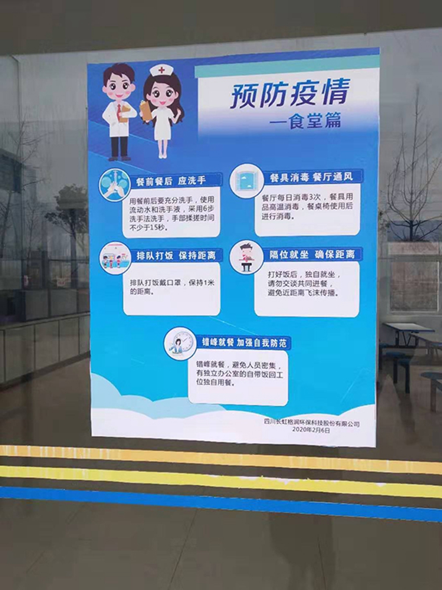 疫情就是命令,防控就是责任,在“新型冠状病毒感染的肺炎”疫情爆发后,长虹格润公司迅速反应,立即成立疫情防控领导小组,多次召开视频会议并提前到现场部署,坚决把疫情防控及员工健康安全放在首位,号召党员干部发挥先锋模范作用,组建8个专项工作小组,从防疫物资采购与管控、员工健康监测、应急处理、园区消毒、员工就餐、防疫工作巡视、人员排查、员工关怀、宣传与培训等方面层层压实责任,通过各小组的共同努力,符合复工条件,复工方案上报属地主管部门,经主管部门现场核准同意格润公司全面复工(已报集团公司备案),公司已于2月12日正式复工,各项生产分批次有序推进。