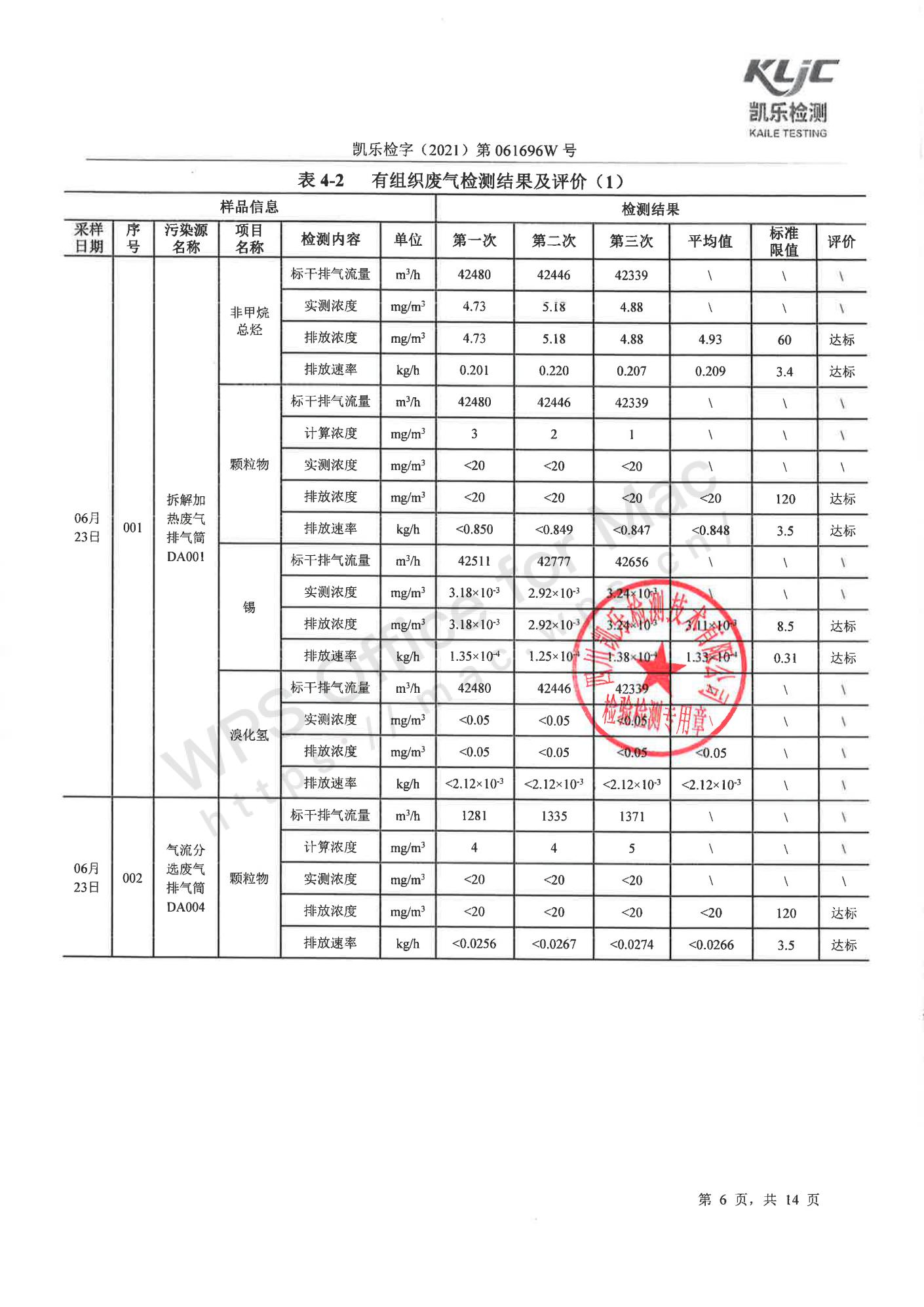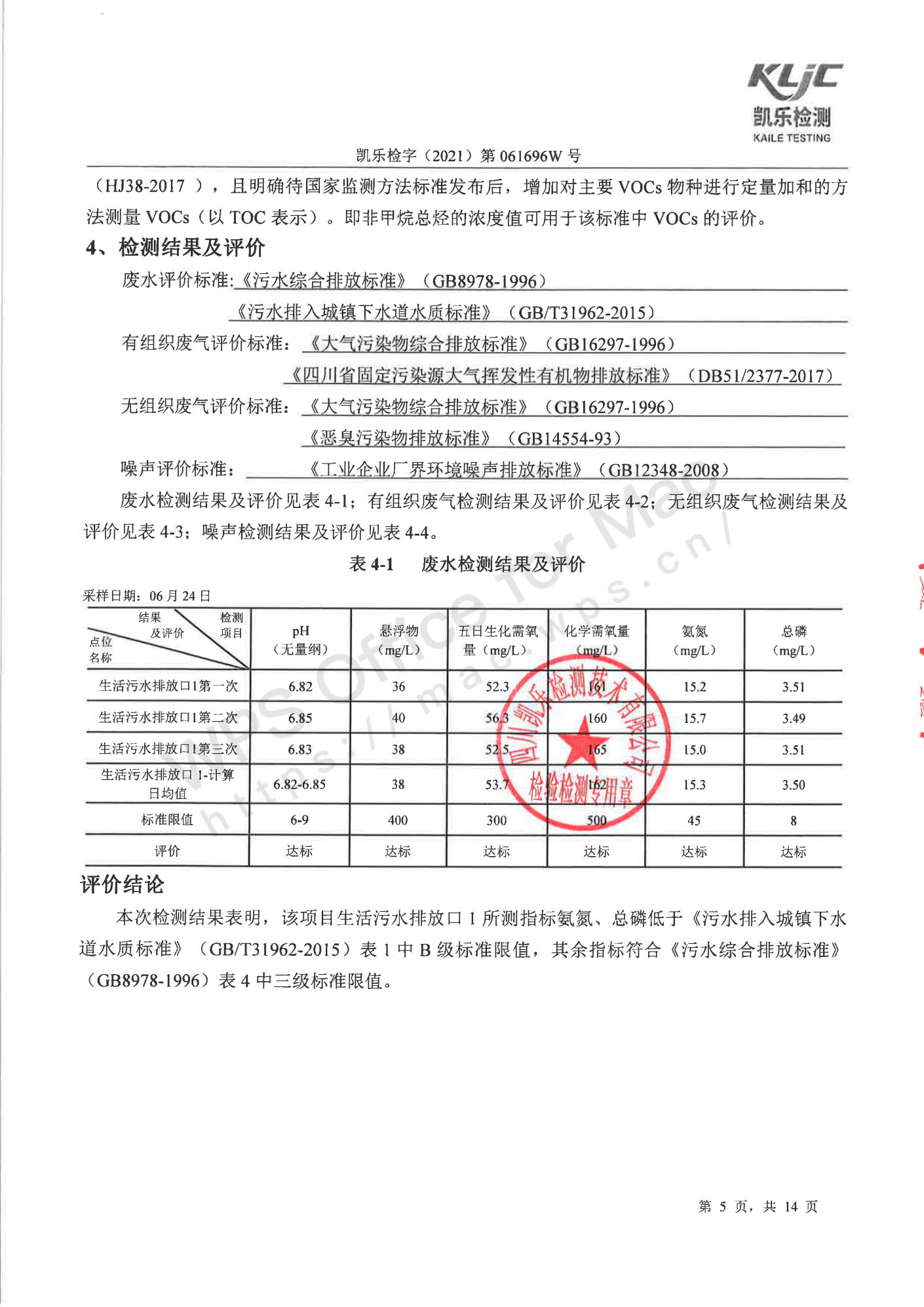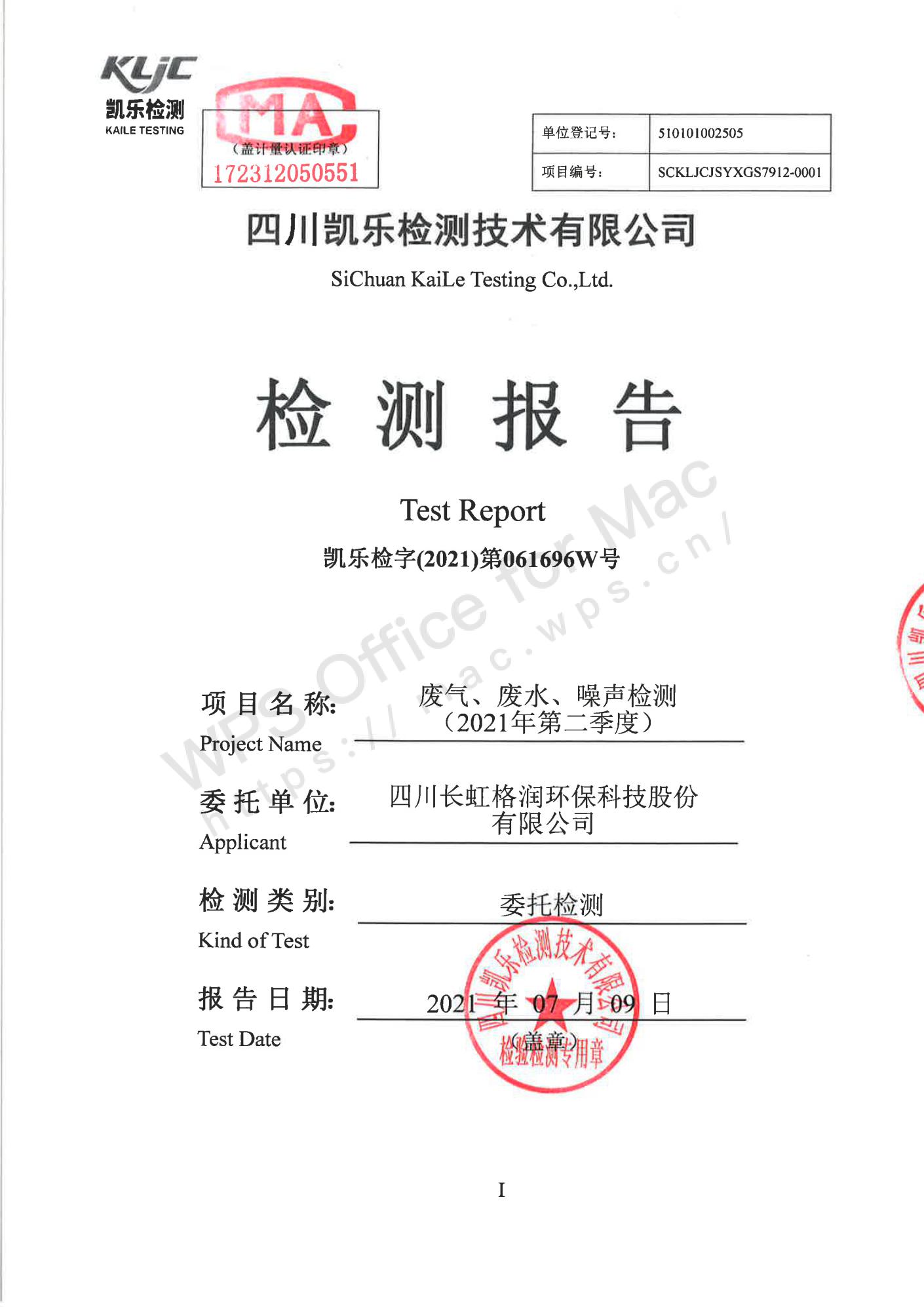 凯乐检字(2021)第061696W号四川长虹格润环保科技股份有限公司(废气、废水、噪声检测(2021年第二季度))