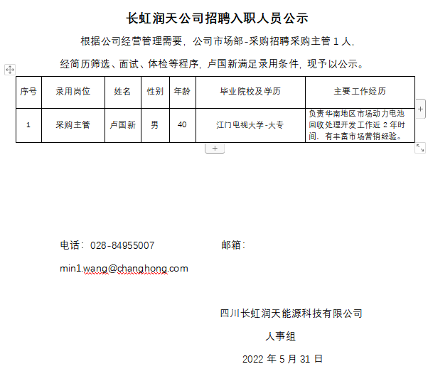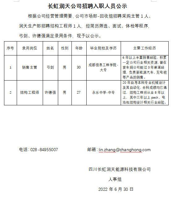 四川长虹润天能源科技有限公司招聘入职人员公示
